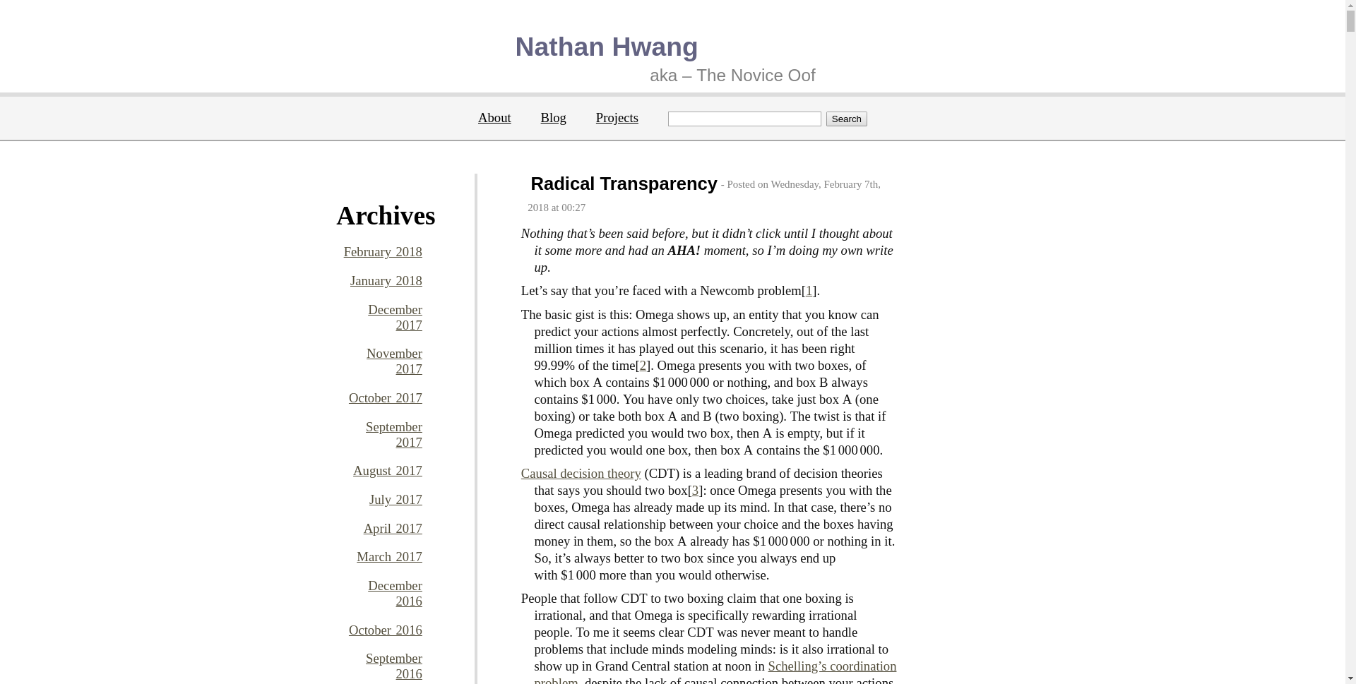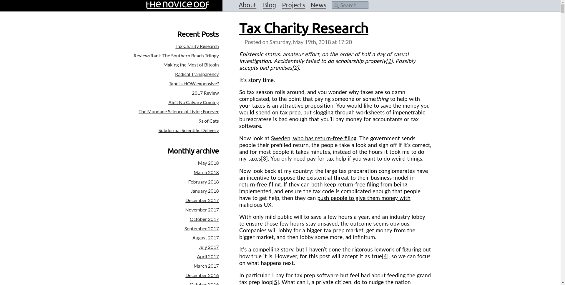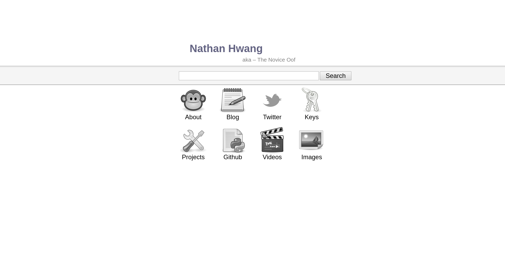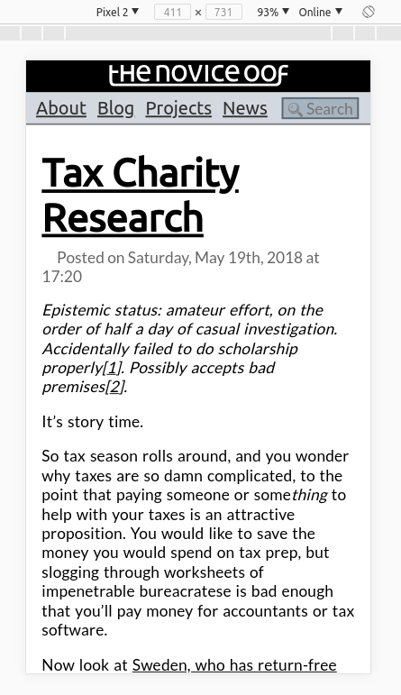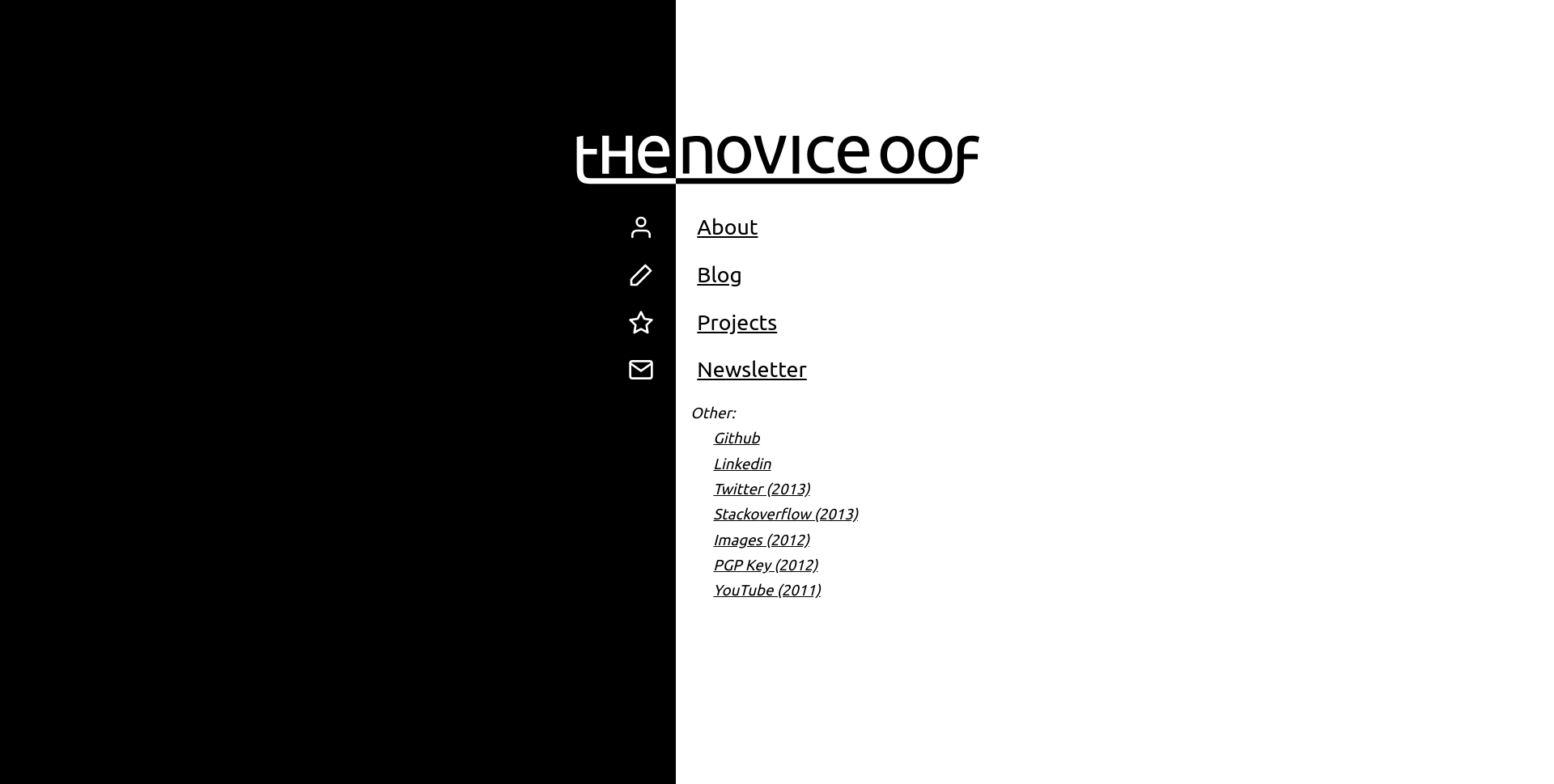 First, on the frontpage, I wanted half the page to be black with white text and the other half to be white with black text. I planned on putting the split between thenovice and oof, which I figured should help people figure out the 3 words that make up the title. However, I also wanted to keep the icons on the left; when I tried to put the icons on the right, it just looked awful in some non-specific way. This meant that I would somehow need to split the page when one element had a wide left side, and another had a wide right side. On the desktop this isn’t a problem, because there’s tons of room in all directions, but on mobile there’s only so much horizontal space to go around, and both sides couldn’t be taking up tons of room.