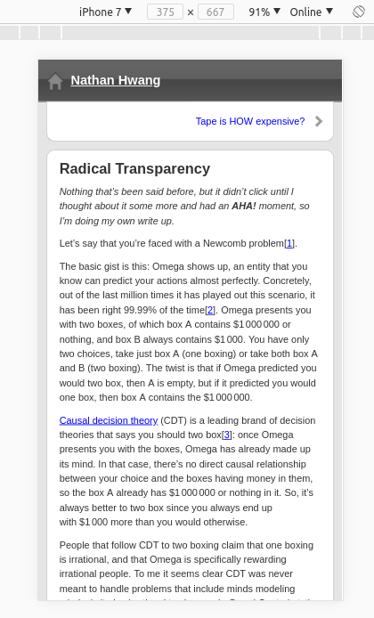 Were there ways around this? Almost certainly, but taken together with all the other problems I’ve described earlier I decided I had to just throw out my current styling, and do it right this time: a fully responsive design, which would work across both desktop and mobile seamlessly[7].